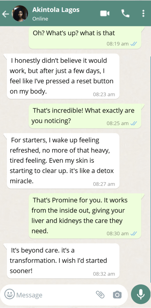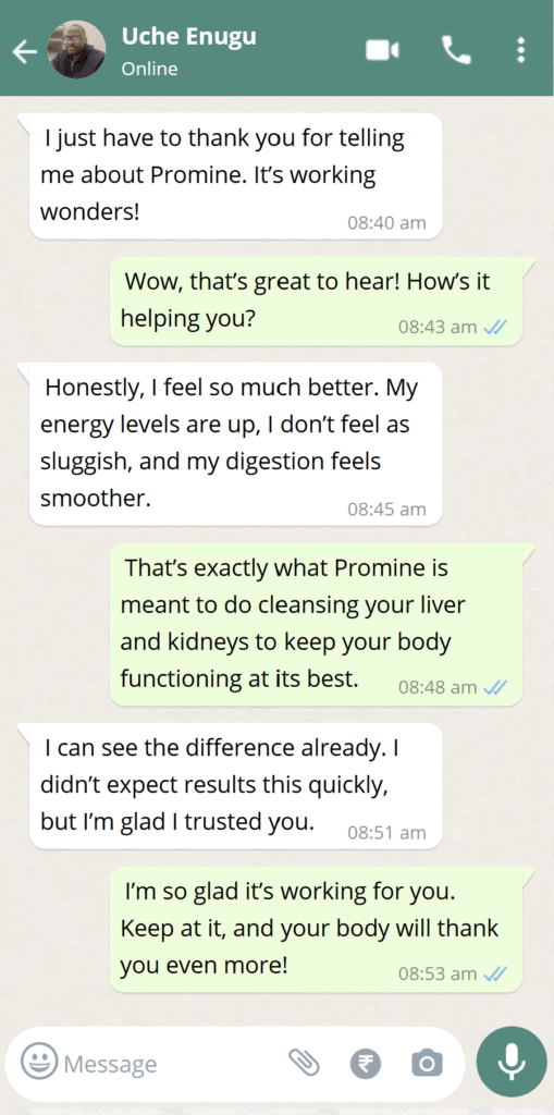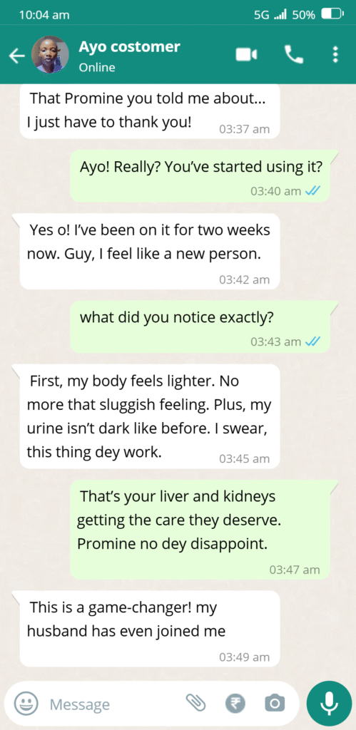 That experience scared him straight. A friend introduced him to Promine a natural immune booster and internal detox made from herbs. He started taking it consistently. Within two weeks, he could breathe better. His energy came back. That heavy tiredness left. The sharp pain disappeared. Now, he buys 5 bottles at once, every time. Why? “Because I no wan hear that hospital talk again,” he says.